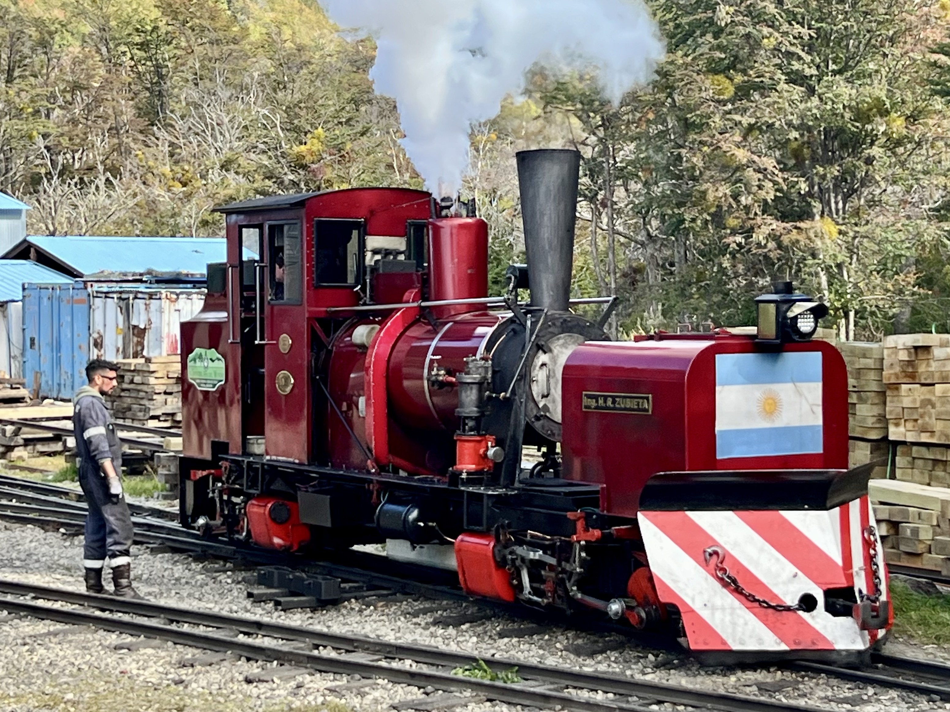 Om eftermiddagen havde jeg (for laenge siden) koebt en billet til verdens sydligste togbane. Den tog i sin tid straffefanger ud for at faelde traeer og hente andre fornoedenheder, men var nu ombygget til at vaere et fint veterantog drevet af entusiaster. Da jeg ankom og henvendte mig omkring toget og dets detaljer, kunne den venlige unge mand godt se, at jeg var entusiast. Og derfor gav han mig en hel tour af de forskellige lokomotiver, vogne, vaerksteder, sporskifte, etc. Det var en super start paa turen, der sluttede med at jeg fik plads i den forreste vogn.